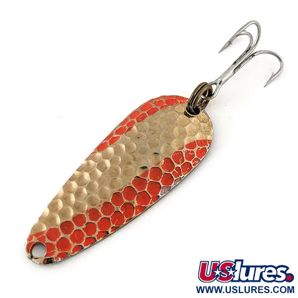 Hamrade guldtexturer definierar ytan på detta vintage 1/4 oz (7 g) Nebco Aqua Spoon-skeddrag, som fångar ljuset över dess klassiska gropiga profil. Med sina 2" (5 cm) är framsidan accentuerad med ett dristigt orangerött fjällmönster som är anmärkningsvärt skarpt för ett bete från denna era. På den släta baksidan i guld finns de tydligt stämplade beteckningarna "AQUA SPOON" och "MINNEAPOLIS", ett kännetecken för dess amerikanska ursprung från mitten av århundradet. Detta exemplar, listat under produktkod 13078, får skicket 5/5 och visar ingen betydande förlust av finish eller komponenter. Den ursprungliga fjäderringen i mässing sitter säkert fäst vid en trekrok i silverfinish, vilket återspeglar den robusta konstruktion som sportfiskare förlitade sig på för insjöfiske. Dess droppform avslutas med ett precisionsborrat linhål i den smala änden för att säkerställa rätt gång vid invevning.