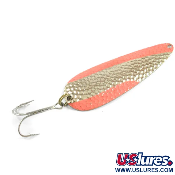 Hamrat guld och livfull orange finish skapar en slående visuell kontrast på framsidan av detta bete, katalogiserat med kod 2452. Med en vikt på 21 g (3/4 oz) och en längd på 9 cm (3 1/2") har skeddraget en djupt hamrad textur utformad för att fånga och reflektera ljus över hela ytan. Baksidan har en slät, polerad guldfinish tydligt stämplad med "AQUA SPOON MADE IN USA", vilket framhäver dess arv från Nebco-tillverkningen. Detta exemplar är i 5/5-skick, med en klar lyster i metallen och välbevarad färg på kanterna. En kraftig trekrok är säkert fäst via en robust fjäderring i mässing i stjärten, medan nosen är förborrad för direkt knytning av linan. Skeddraget är utformat för traditionellt spinnfiske eller trolling, och dess droppform och tyngd ger den densitet som krävs för långa kast och djupkontroll i öppet vatten.