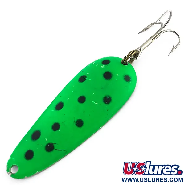 Sprecklad med svarta punkter över en levande grön finish, framhäver detta vintagefynd en klassisk grodmönstrad estetik som ofta föredrogs av sportfiskare under mitten av seklet. Vikten på 16g (3/5oz) ger tillräcklig tyngd för djupa kast vid vegetationskanter eller trolling längs branter. På baksidan har skeddraget en yta av polerad nickel som ger en skarp metallisk blixt och kontrasterar mot den målade framsidan. Tillverkat i USA av Nebco under produktkod 8841, har draget en klassisk droppformad profil som mäter 7,5cm (3") på längden. Det är i mycket gott skick med betyget 4/5 och visar endast mindre tecken på ålder på hårdvaran. En stor, vass trekrok är fäst via en fjäderring, vilket gör det redo för både samlarhyllan och fiskeuren. I dragets ovandel finns ett rent borrat hål för infästning av tafs.