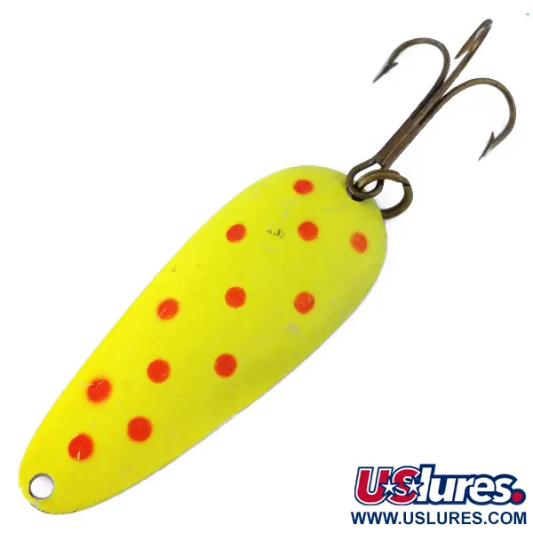 Detta skeddrag är 7 cm (2 3/4") långt och har en gul basfärg med hög synlighet prydd med tydliga röda prickar. Denna specifika Aqua Spoon UV från Nebco, katalogiserad under kod 10859, väger 17 g (3/5 oz) och är konstruerad för kastfiske eller trolling under olika ljusförhållanden. Betets baksida har en traditionell nickelfinish som ger en metallisk blixt som kompletterar den ljusa framsidan. En utmärkande egenskap hos denna USA-tillverkade modell är dess fluorescerande egenskaper; som visas i bilderna avger betet ett starkt grönt sken när det aktiveras av UV-ljus. Komponenterna inkluderar en robust fjäderring och en vass, mörk trekrok. Färgen är fortfarande levande och metallytorna är rena, vilket ger detta vintagebete ett skickbetyg på 5/5.