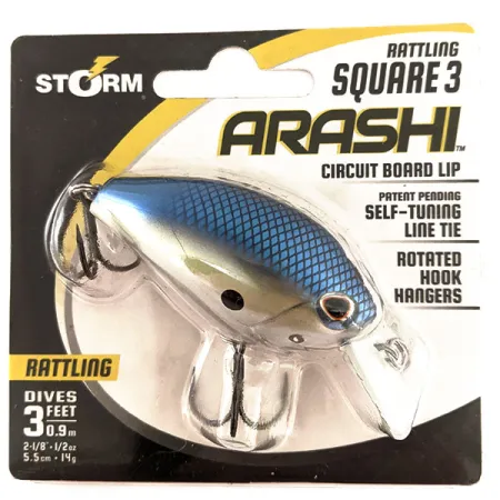 Storm Arashi Rattling Square 3 väger 14g (1/2oz) och är byggd med en tunn sked av kretskortsmaterial som underlättar en snabb dykning till dess simdjup på 0,9m (3ft). Den 5,5cm (2 1/4") långa kroppen i färgen Black Silver Shad har en fjällmönstrad blå-silverfärgad rygg, silverfärgade sidor och en svart prick vid gälarna. Tekniska detaljer som den självjusterande linöglan och de roterade kroköglorna visar på Storms fokus på teknisk prestanda, specifikt utformade för att hjälpa betet att navigera genom vegetation och hinder. Detta oanvända exemplar med produktkod 11675 levereras i originalförpackning. Designen inkluderar en intern rasselkammare och en fyrkantig skedprofil som är gjord för att studsa mot undervattenshinder vid både spinnfiske och trolling.
