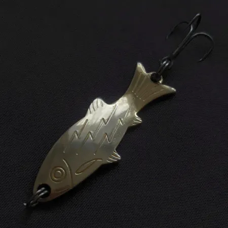 Stämplad med ”AL”-logotypen och ”Providence R.I.” på baksidan, ger detta klassiska amerikanska skeddrag en intressant inblick i Atlantic Lures tillverkningshistoria. Med en längd på 4,5 cm har Golden Wobble-Fish en detaljerad fiskprofil, komplett med präglade fjäll, fenor och ett tydligt öga. Den skimrande guldfinishen är fortfarande blank, och metallkroppen väger 5 g, designad för spinnfiske eller vertikalfiske under olika vattenförhållanden. Komponenterna inkluderar robusta fjäderringar och en mörkfärgad trekrok som är i utmärkt skick. Skicket är bedömt till 4/5, och metallytorna är välbevarade med endast mindre kosmetiska märken, främst på baksidan nära tillverkarens text. Detta exemplar är tillverkat i USA, har produktkod 22562 och uppvisar den skarpa prägling som var typisk för fiskeredskapstillverkningen i Rhode Island under mitten av seklet.