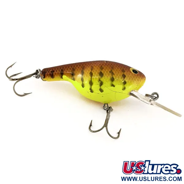 Fire Tiger-mönster som på detta exemplar på 14g (1/2oz) är legendariska för sitt höga kontrastutseende i grumligt vatten. Denna Bagley Mama CAT, identifierad med produktkod 11354, representerar det klassiska amerikanska hantverket av trävobbler från USA. Med en längd på 7 cm (2 3/4") har kroppen en varm brun-till-gul gradient som accentueras av mörka vertikala ränder och ett subtilt fjällmönster längs ryggåsen. Den överdimensionerade hakskeden i klarplast är utformad för djupt fiske och är ordentligt fäst i träkroppen tillsammans med två robusta trekrokar. När det gäller skick får detta bete betyget 3/5; finishen visar åldersrelaterad karaktär genom fina ytsprickor på de gula sidorna, vilket är vanligt för vintage balsa- och träbeten. De stora gula ögonen med tydliga svarta pupiller är fortfarande klara, vilket ger det signaturutseende som samlare letar efter i autentiska Bagley-beten. Varje detalj, från hårdvaran till de specifika färgövergångarna, belyser den praktiska designen hos detta djupgående verktyg.