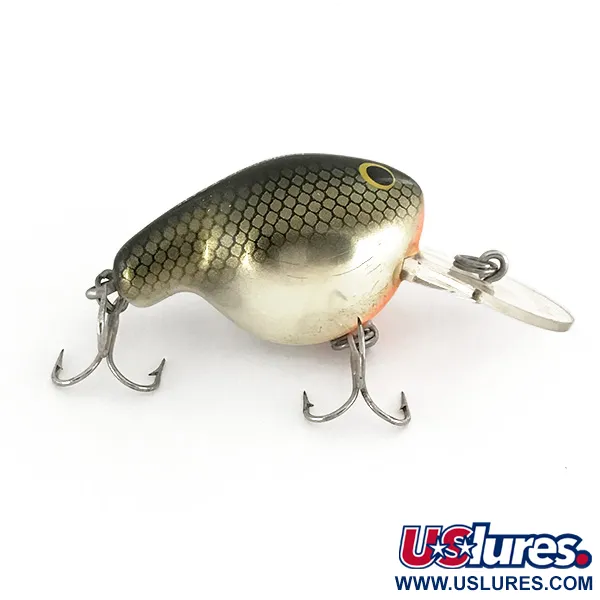 Med en vikt på 9g (1/3oz) representerar detta vintage-exemplar en klassisk era av amerikansk betestillverkning från Bagleys verkstäder. Färgmönstret TS har en slående metallisk övergång från guld till silver på sidorna, toppat med ett detaljerat mörkt fjällmönster längs ryggen. Med en längd på exakt 5cm (2") bär denna Bagley's Fat Cat produktkod 7481 och är konstruerad som en flytande rassel-wobbler för fiskedjup på 1,5m - 2m. Detta specifika exemplar är i utmärkt skick, rankat 5/5, med originalets klara finish på skeden och en klar orangeröd accent under hakan. De gula ögonen med svarta pupiller sitter snyggt mot den metalliska finishen, och hårdvaran är fortfarande blank. Dess breda profil är karakteristisk för serien, designad för att skapa en specifik närvaro i vattenpelaren vid hemtagning. Fjällmönstret på den övre halvan är skarpt och övergår smidigt i den polerade silverfärgen på magen.