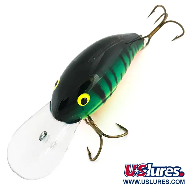 Livliga gröna och svarta vertikala ränder dominerar den övre halvan av detta klassiska Fire Tiger-mönster. Denna Bandit 200 väger 8,5 g (1/3 oz), mäter cirka 51 mm (2 tum) och är konstruerad för att nå djup på upp till 3 m (9,8 fot). Övergången från den mörkgröna ryggen till en klargul sida och en varm orange buk ger en profil med hög kontrast under vattnet. Två trekrokar med bronsfinish är fästa via robusta fjäderringar på buk- och stjärtsektionerna. Den överdimensionerade genomskinliga plastskeden är det definierande draget hos denna flytande, rasslande djupgående crankbait. Detta exemplar, med produktkod 6807, är ett utmärkt exempel på amerikansk betestillverkning avsedd för spinnfiske eller trolling efter gädda och gös. Betet är i utmärkt 5/5 skick, med en glansig finish och vassa krokar.