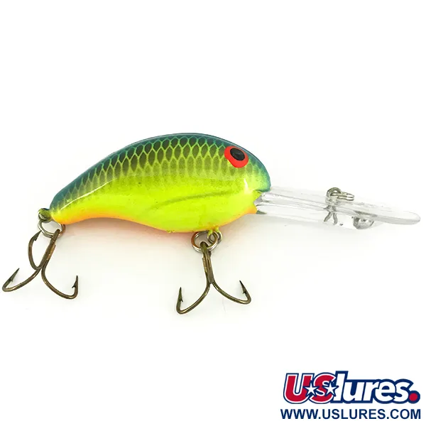 Detaljerat fjällmönster längs ryggen övergår i en livlig neongul färg på detta Chartreuse Blue Back-mönster. Bandit 300 är utformad som ett djupgående verktyg, bär produktkod 6813 och är konstruerad för att nå djup på 2,4–3,6 m. Denna flytande crankbait väger 10,5 g och mäter kompakta 5 cm i längd, vilket gör den till ett pålitligt val för både spinnfiske och trolling. Den visuella profilen förstärks av en klarorange buk och framträdande röda ögon, vilket ger en skarp kontrast för rovfiskar som gädda och gös. En stor, genomskinlig sked är säkert förankrad i kroppen för att hantera motståndet vid invevning på djupt vatten. Detta specifika exemplar är i 5/5-skick, med en ren finish och vassa, bronsfärgade trekrokar. En ljudlig intern rasselkammare lägger till ett akustiskt element till presentationen, en signaturdetalj för denna klassiska USA-tillverkade modell.