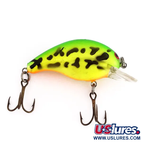 Detta specialiserade crankbaits Fire Tiger-mönster lyser intensivt under svaga ljusförhållanden och visar varför UV-aktiva ytbehandlingar är så eftertraktade av moderna sportfiskare. Denna Bandit Rackit Squarebill UV, med produktkod 9869, har en distinkt kropp i chartreuse och limegrönt, accentuerad av kraftiga svarta fläckar och en lysande orange buk. Med en vikt på 1/4oz (7g) och en längd på 2" (5cm) är wobblern flytande, vilket passar för både spinnfiske och trolling. Den fyrkantiga plastskeden gör att den når djup mellan 0,6 m och 1,2 m, vilket gör den till ett pålitligt val vid fiske efter gös eller gädda på grundare partier. Den interna rasselkammaren ger en ljuddimension till dess gång i vattnet. De två trekrokarna är säkert monterade med robusta fjäderringar. Exemplaret är i utmärkt skick (betyg 5/5) utan synligt slitage på lacken eller den transparenta skeden.