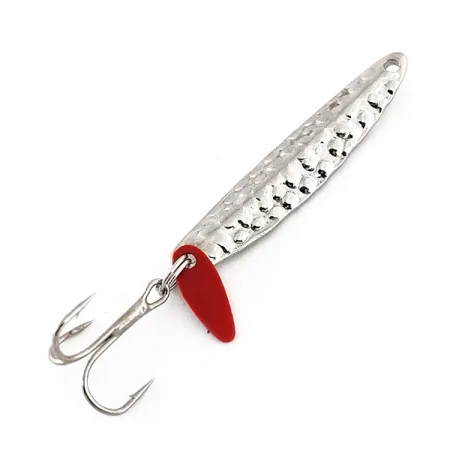 Med en vikt på 3/16oz (6g) ger den hamrade nickelfinishen på denna Bay de Noc Swedish Pimple 3 en strukturerad yta som är utformad för att fånga och sprida ljus i djupt eller grumligt vatten. Detta exemplar, som mäter exakt 4,5cm (1 3/4") i längd och identifieras med produktkod 11563, har den ikoniska slanka profil som har definierat den Michigan-baserade tillverkarens sortiment i decennier. En framträdande visuell detalj är det lysande röda fluorescerande lockblänket som är fäst nära trekroken och fungerar som en tydlig målpunkt för rovfiskar. Metallkroppen och komponenterna är i utmärkt skick, vilket ger ett betyg på 5/5. Konstruktionen möjliggör vertikal presentation, vilket gör den till en stapelvara för både pimpelfiske och vertikalfiske på sommaren efter abborre eller gös på djupt vatten. Den hamrade texturen är specifikt avsedd att bryta upp reflektioner för att efterlikna betesfiskens naturliga fjällmönster, medan den klassiska USA-tillverkade hårdvaran förblir tät och funktionell.