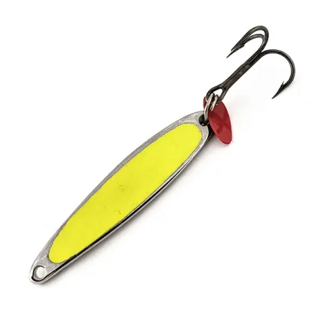 Förnickling ger en bas av högreflekterande silver som fångar allt tillgängligt ljus, vilket gör det till ett utmärkt val för djupare eller grumliga vatten. Denna specifika Bay de Noc Swedish Pimple #4 UV, katalogiserad som produktkod 13119, har ett lysande gult fluorescerande inlägg som fungerar som en tydlig huggpunkt. Med en vikt på 1/4 oz (7 g) och en längd på 2" (5 cm) är dragets slanka, aerodynamiska profil designad för precision vid vertikalfiske eller kast från båt. Tillägget av ett litet rött plastlockblad fäst vid fjäderringen ger en sekundär fokuspunkt, vilket ofta fungerar som en trigger för inaktiv fisk. När det gäller hårdvaran hittar du en vass trekrok och robusta fjäderringar som kännetecknar den kvalitetstillverkning Bay de Noc har bibehållit i USA i över ett halvt sekel. Skicket på detta exemplar är en krispig 5/5 och visar inga tecken på slitage på nickelfinishen eller den gula dekalen. Viktfördelningen möjliggör en kontrollerad sjunkhastighet genom vattenpelaren, vilket säkerställer att sportfiskaren kan bibehålla kontakten med draget på djupet.