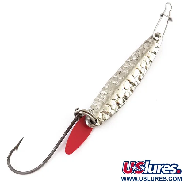 Den hamrade nickelfinishen på denna 4 cm (1 1/2") vertikalpirk skapar en kraftigt strukturerad yta som effektivt fångar och sprider ljuset under olika vattenförhållanden. Med en vikt på 5 g (3/16 oz) har denna Bay de Noc Swedish Pimple, produktkod 4856, den klassiska slanka kroppsformen som kännetecknar detta legendariska bete. Detta specifika exemplar är i skick 5/5 och har kvar sin högblanka silverlyster och tydliga textur. Ett karakteristiskt fluorescerande rött lockblad i plast är fäst vid den nedre fjäderringen, vilket ger en skarp färgkontrast mot metallkroppen för att fungera som huggmarkör. Betet är utrustat med en enkelkrok och ett beteslås vid huvudet för direkt lina. Dessa beten är tillverkade i USA och har sina rötter i skandinaviska vertikalfisketraditioner och har tillverkats av Bay de Noc i över ett halvt sekel. All hårdvara, inklusive fjäderringar och beteslås, är blank och i nyskick.