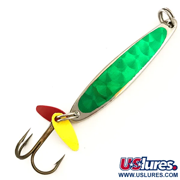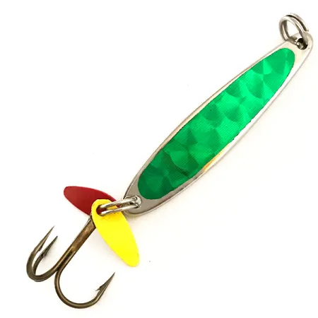 Förnickling utgör grunden för denna klassiker på 7 g (1/4 oz). Ovansidan har en livfull grön prisma-dekal, designad för att fånga och reflektera ljus med ett tydligt diamantmönster. Med ett mått på exakt 5 cm (2") är detta exemplar i en mångsidig storlek för både vertikalpimpel och spinnfiske. I änden sitter en robust trekrok utrustad med de karakteristiska dubbla lockskedarna i plast – en röd och en gul – som fungerar som en högvisuell kontrast mot den silverfärgade kroppen. Denna pirk tillverkas av det Michigan-baserade företaget Bay de Noc och återspeglar deras långvariga fokus på effektiva mönster för isfiske och jiggfiske i öppet vatten. Skicket är graderat till 5/5, med en blank, ren nickelfinish på baksidan och en välbevarad dekor. Katalogiserad under produktkod 6359, ser den tunga metallkroppen till att den snabbt når huggzonen.