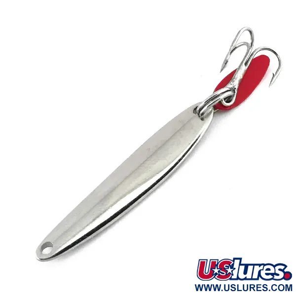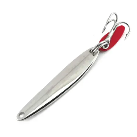En klassisk nickelfinish täcker denna 3,5 cm (1 1/2") vertikalpirk och ger den höga reflektionsförmåga som krävs vid djupt fiske. Bay de Noc har tillverkat dessa i Michigan i årtionden, och detta specifika exemplar på 4,5 g (3/16 oz), med produktkod 8730, visar den solida konstruktion som är synonym med märket. Notera det livfulla röda lockbladet i plast vid trekroken; det fungerar som en visuell huggpunkt för fisken i mörka vatten. All hårdvara, inklusive fjäderringar och trekrok, är i utmärkt skick och får betyg 5/5. Den droppformade profilen är främst designad för vertikalfiske och når snabbt måldjupet både i öppet vatten och vid isfiske. Ett rent fästhål finns i pirkens smalaste ände för direkt tackling.