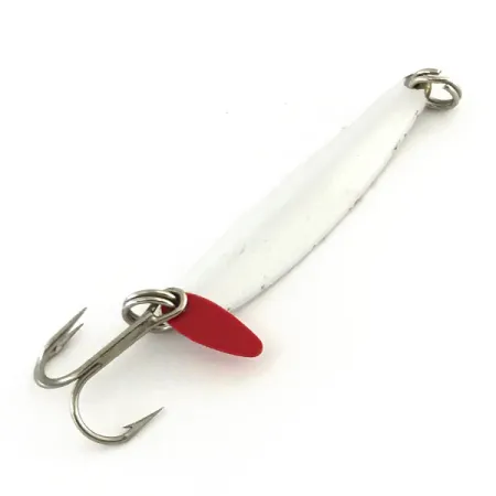 Pärlemorvit färg täcker den slanka metallkroppen och ger en profil med hög kontrast för fiske på djupt vatten. Denna Bay de Noc Swedish Pimple väger 9 g (1/3 oz), har produktkod 8794 och mäter 4,5 cm (1 3/4"). Den karakteristiska röda lockskivan i plast sitter fäst vid trekroken och fungerar som en tydlig huggpunkt för att locka nyfiken fisk till hugg. Som ett bevis på sin tid i fiskelådan har draget små, mjuka lacksläpp längs kanterna, vilket ger det ett skickbetyg på 4/5. Denna USA-tillverkade klassiker är en hörnsten för vertikalt jigging-fiske som används vid både pimpelfiske på isen och i öppet vatten.