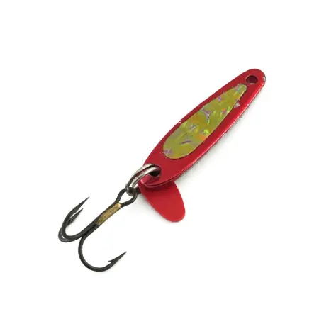 Livröd emalj täcker framsidan av denna 2,5 cm (1") pirk, som fångar ljuset tillsammans med ett texturerat holografiskt prismaklistermärke. Med en vikt på 2 g (1/16 oz) har denna Bay de Noc Swedish Pimple, med produktkod 8936, den karakteristiska platta profilen som gjort den till en klassiker bland Michigan-tillverkad fiskeutrustning i generationer. På baksidan har metallen en ren, polerad silverfinish som ger ett högkontrasterande blänk. Monteringen inkluderar en robust fjäderring som håller både den vassa trekroken och en liten, fluorescerande röd locksked i plast, utformad för att ge en tydlig visuell accent vid vertikalfiske eller kast. Just detta exemplar är i 5/5-skick och behåller sin ursprungliga lyster och skarpa kanter på den målade ytan och klistermärkena. Det återspeglar den enkla men effektiva designfilosofi som är typisk för företaget i Gladstone, Michigan.