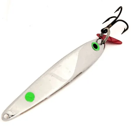 Med en rejäl vikt på 40g (1 1/3 oz) är detta tunga vertikalpirk ett specialiserat verktyg för att nå stora rovfiskar på djupt vatten. Den blanka nickelkroppen ger betydande blänk, förstärkt med två fluorescerande gröna punkter; en fungerar som ett öga med mörkt centrum, medan den andra sitter nära stjärten. Utrustad med en robust Mustad-trekrok och ett klassiskt rött lockblad i plast, är detta 10cm (4") långa bete avsett för djup över 5m (16ft). Som den större storleken #9 i Bay de Noc-serien bär den produktkod 13034 och är i nyskick (5/5). Denna USA-tillverkade klassiker är konstruerad för tungt vertikalfiske i både öppet vatten och vid pimpelfiske efter troféstor gös eller insjööring.