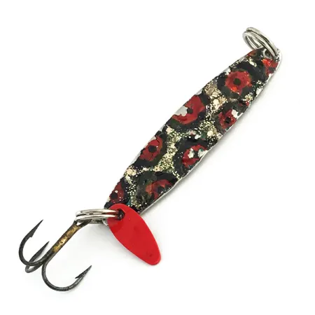 Hamrad nickel utgör basen för detta 4,5 cm långa vertikalbete. Framsidan har ett iögonfallande handmålat mönster med röda och svarta prickar på en guldglittrande bas, levererat i utmärkt 5/5 skick. Med en vikt på 6 g bär detta specifika exemplar produktkod 9084 och visar upp det klassiska hantverket från Bay de Noc i Gladstone, Michigan. En röd signatur-locksked i plast är fäst i den nedre fjäderringen tillsammans med en vass trekrok, designad för att ge en väl synlig målpunkt för fisk i djupare vatten. Baksidan exponerar den djupt strukturerade ytan i hamrad metall, avsedd att fånga och reflektera ljus från olika vinklar. Betet används för både spinnfiske i öppet vatten och vertikalt isfiske, och dess slanka men tunga form speglar över femtio år av designutveckling inspirerad av traditionella skandinaviska fiskeredskap.