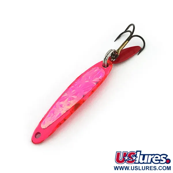 Fluorescerande rosa toner dominerar finishen på denna 4 cm (1 1/2") vertikalpirk i metall, vilket säkerställer hög synlighet även i grumligt eller djupt vatten. Tillverkad av det amerikanska företaget Bay de Noc under produktkod 9385, representerar denna Swedish Pimple ett designarv influerat av skandinaviska traditioner för vertikalfiske. Den slanka kroppen har ett texturerat, mönstrat inlägg på ena sidan som ger ett subtilt holografiskt glimmer vid rörelse. Den levereras utrustad med en vass trekrok och ett litet rött lockblad fäst med en fjäderring, vilket fungerar som en visuell huggpunkt. Med en vikt på 5 g (3/16 oz) är den ett mångsidigt val för sportfiskare som jagar abborre eller öring vid pimpelfiske eller från båt. Exemplaret är i utmärkt skick, betygsatt 5/5, och har behållit sin ursprungliga livfulla färg. Under ultraviolett ljus reagerar beläggningen med ett kraftigt sken, en teknisk detalj avsedd att locka fisk i miljöer med svagt ljus.