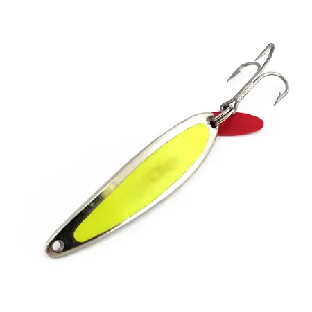 En lysande chartreuse fluorescerande dekal ger en skarp visuell kontrast mot den polerade nickelpläteringen på denna 14 g (1/2 oz) vertikalpirk. Denna Bay de Noc Swedish Pimple, med produktkod 9882, har den klassiska slanka profil som kännetecknat märket i årtionden. Metallkroppen mäter exakt 5,5 cm (2 1/4") och är försedd med en röd lockskiva i plast fäst i den bakre fjäderringen, precis framför trekroken. Detta USA-tillverkade bete är i skick 5/5, med en ren finish och vassa krokar. Tvåfärgsdesignen möjliggör en kombination av starka reflexer och stadig synlighet under vertikalfiske. Ett enda fästhål i nosen håller montaget strömlinjeformat för fiske på djupt vatten.