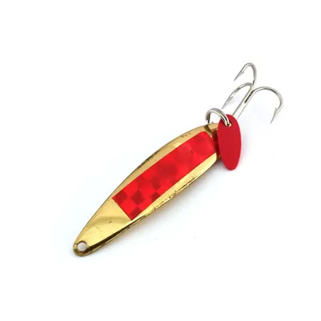 Denna vertikalpirk väger 1/2 oz (14 g) och har en klassisk mässingsfinish som har förtjänat sin plats i många fiskelådor för vinterfiske. Framsidan är förstärkt med ett livfullt rött holografiskt klistermärke i ett tydligt schackrutigt mönster för att maximera ljusreflektionen på djupt vatten. Detta specifika exemplar, katalogiserat under produktkod 9902, mäter 2 1/4" (5,5 cm) i längd och håller ett utmärkt skick på 5/5. På den bakre fjäderringen sitter det karakteristiska röda lockbladet i plast, ett signum för Bay de Noc-designen som används för att skapa en visuell attraktionspunkt tillsammans med den silverfärgade trekroken. På baksidan är den solida mässingskroppen tydligt stämplad med tillverkarens logotyp. Sedan mitten av 1900-talet har Michigan-baserade Bay de Noc tillverkat dessa i USA, och denna mässing/röda variant förblir en stapelvara vid fiske efter gös eller abborre. Pirkens nos har ett precisionsborrat fästhål som bibehåller den slanka profilen för att möjliggöra en snabb sjunkhastighet.