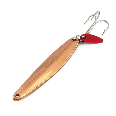 Kopparfärgad och med en vikt på 1/4 oz (7 g), representerar denna vertikalpirk årtionden av Bay de Nocs expertis inom specialiserad betestillverkning. Dess 2-tums (5 cm) smala profil gör att kroppen sjunker snabbt, en designegenskap som ursprungligen perfektionerades av skandinaviska sportfiskare för vertikalfiske på djupt vatten. Ett ljusrött lockblad i plast är monterat vid stjärten, vilket ger en skarp färgkontrast mot kroppens varma metallfinish. Detta exemplar har produktkod 9903 och håller en hög finish över hela sin välvda yta, vilket resulterar i ett skickbetyg på 5/5. Den robusta trekroken är fäst med en kraftig fjäderring, vilket säkerställer att hårdvaran matchar betets rykte för fiske efter öring och gös. Tillverkningen av dessa exemplar sker i USA, där Bay de Noc fortsätter att producera denna specifika siluett som har förblivit i stort sett oförändrad i generationer.