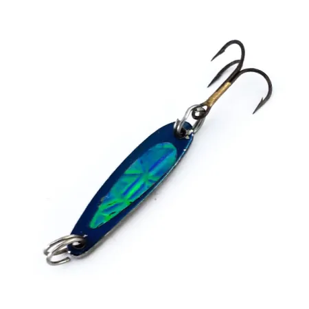 Med en vikt på endast 1/16 oz (2 g) är denna lilla vertikalpirk den minsta modellen i Bay de Nocs sortiment. Den mäter 2,5 cm (1") i längd och framsidan har en djupblå finish prydd med en levande holografisk prismadekal som skiftar i toner av grönt och kricka. Detta ljusreflekterande element kombineras med en polerad silverbaksida, vilket ger en högvisuell kontrast som är särskilt effektiv i grumligt vatten eller vid svaga ljusförhållanden under isen. Katalogiserad som produktkod 9956, har detta exemplar kvar sina originalfjäderringar och en vass trekrok. Hårdvaran är blank och funktionell, och det allmänna skicket är 5/5. Dessa amerikansktillverkade beten har varit en stapelvara i över femtio år tack vare sin solida metallkonstruktion, designad för att sjunka snabbt till huggzonen för abborre, öring eller gös.