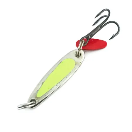 Med en smal, aerodynamisk profil och en vikt på 2 g (1/16 oz) framhäver detta exemplar den tidlösa designen hos en klassiker för isfiske från Mellanvästern. Den polerade nickelkroppen accentueras av en livlig chartreuse-dekal som avslöjar sina luminescerande egenskaper vid svagt ljus, vilket ger en tydlig självlysande huggpunkt. Med en längd på 3 cm (1 1/4") är detta bete ett utmärkt val för vertikalfiske genom isen eller kast i öppet vatten. Utrustningen inkluderar en vass trekrok och det ikoniska röda lockskeden i plast som är fäst nära kroken för att skapa visuell kontrast. Tillverkad av Bay de Noc i USA under produktkod 9013, och konstruktionen förblir robust. I sitt nuvarande skick, betygsatt 5/5, är finishen blank och reflekterande, med chartreuse-remsan ordentligt intakt. Denna specifika modell används ofta för abborre och öring, och förlitar sig på sin högvisuella locksked för att locka fisk i djupare vattenlager.