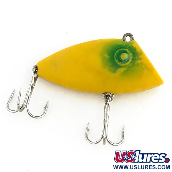 Denna lipless crankbait väger 7g (1/4oz) och uppvisar det klassiska USA-tillverkade hantverket från Bayou Boogie-serien. Profilen på 5cm (2") har en livlig gul basfärg, accentuerad av en tydlig grön fläck runt ögat och en subtil orange nyans på nosen. Detta exemplar med produktkod 8831 har en toppmonterad linögla vilket ger den dess sjunkande egenskaper. Whopper Stopper designade dessa som ljudliga sökbeten, effektiva för att fiska av olika vattendjup efter arter som abborre eller bass. Hårdvaran består av två robusta originaltrekrokar. Detta vintagebete har ett skickbetyg på 4/5, med rena ytor och välbevarad färg med endast små tecken på ålder.