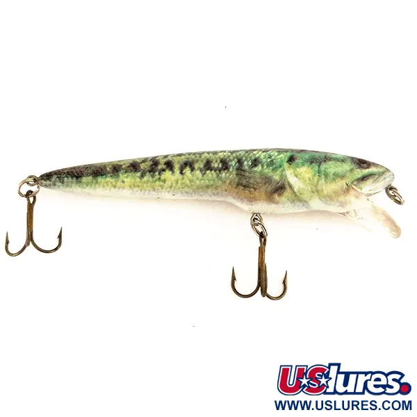 Denna Berkley Frenzy FWD4S är en enastående flytande minnow på totalt 10 cm (4 tum) från produktionsserien med kod 9597. Betet väger 14 g (1/2 oz) och är konstruerat med en klar, avrundad sked som ger ett fiskedjup på 1,2 m (3,9 fot). Skicket är 5/5, och den fotorealistiska baby bass-finishen är levande och helt utan slitage. Mönstret har en mörkgrön rygg som går över i gulgröna sidor med de karaktäristiska mörka sidofläckarna hos en ung abborre. Hårdvaran på detta bete tillverkat i USA inkluderar mörka originaltrekrokar och en stark fjäderring i nosen. Berkley använde denna realistiska estetik för att överbrygga gapet mellan traditionella målade beten och moderna högupplösta ytbehandlingar. Ett par mörka, fixerade ögon ger en naturlig fokuspunkt nära betets huvud.