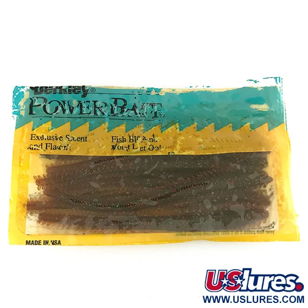 Dessa gummibeten mäter exakt 15 cm (6") och representerar en avgörande era inom doftsatt betesteknologi. Detta specifika paket, som väger 17,3 g (0,61 oz), kommer i färgen Red – en genomskinlig, mörkt brunröd nyans mättad med fina röda glitterflakes. Detta 8-pack, med produktkod 7097, är oanvänt i sin ursprungliga vintageförpackning i gult och blått. Designen har en kraftigt räfflad kropp som smalnar av till en slank stjärt, en form optimerad för jiggfiske och presentationer längs botten. Tillverkad i USA, och förpackningen innehåller den ikoniska Berkley-prestandatabellen på baksidan, vilket betonar det vetenskapliga tillvägagångssättet i deras PowerBait-formel. Den mjuka texturen och de detaljerade räfflorna är karakteristiska för den kvalitet Berkley höll under denna produktionsperiod.