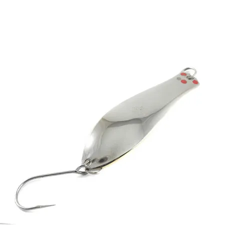 Med en vikt på 30g (1oz) är detta Big Doctor 285 skeddrag ett utmärkt exempel på de kraftfulla redskap som Prescott Spinner tillverkade i USA. Den 11cm (4 1/4") långa kroppen har en design med dubbla ytbehandlingar, med en spegelblank front i nickel och en varmt guldfärgad baksida. Fyra små röda prickar är noggrant applicerade nära betets huvud, vilket ger en färgklick mot den polerade metallen. Listad under produktkod 1177, är betet i skick 5/5, där varken pläteringen eller den enkla kroken visar några tecken på användning. Konstruktionen bygger på starka fjäderringar för att koppla samman hårdvaran med den stansade metallkroppen, ett kännetecken för beten avsedda för både spinnfiske och trolling.