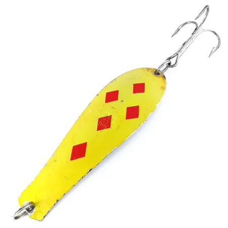 Fem röda diamanter kontrasterar skarpt mot den klargula basen på detta klassiska amerikanska skeddrag. Med en vikt på 28g (1oz) och en längd på 11cm (4 1/4") förblir Prescott Spinner Big Doctor 285 UV ett gediget val för sportfiskare som jagar stora rovfiskar genom kastfiske eller trolling. Detta exemplar, med produktkod 10718, har ett skickbetyg på 4/5 och visar mindre tecken på sin ålder men behåller en livfull yta med hög synlighet. Den mest slående tekniska aspekten är den fluorescerande egenskapen hos den gula färgen; under ultraviolett ljus avger beteskroppen ett starkt grönt sken, vilket lämnar de röda diamantstämplarna som mörka siluetter med hög kontrast. En subtil detalj finns i den mellersta diamanten, där namnet "Big Doctor" är stämplat direkt i metallen. Betet är utrustat med en kraftig trekrok och originalfjäderringar, redo för samlingen eller för att återvända till vattnet.