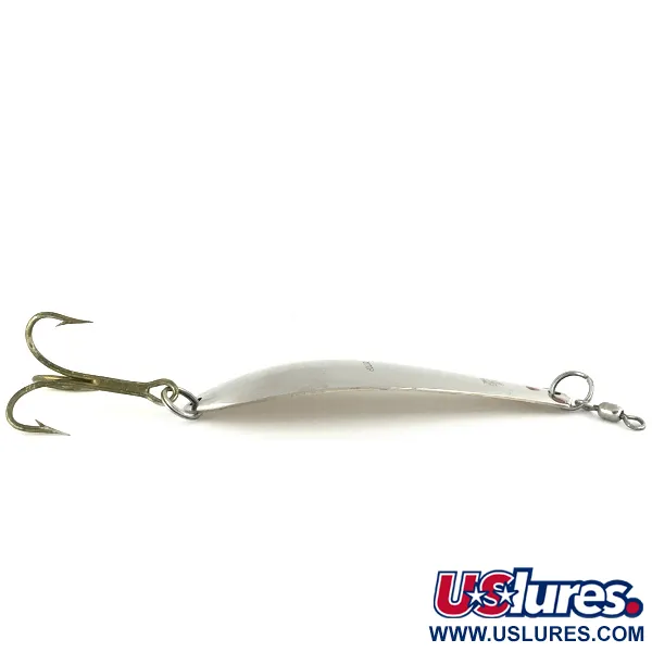Med en rejäl vikt på 30g (1oz) är detta skeddrag perfekt anpassat för att nå predatorer på djupt vatten. Draget mäter 11cm (4 1/4") och har en tvåfärgad estetik med en polerad silversida och en fyllig guldfärgad baksida. Små röda detaljer vid den övre öglan ger en färgklick mot den blanka metallkroppen. På silversidan finns "DOCTOR" tydligt instämplat, vilket identifierar denna modell med produktkod 7110. Detta USA-tillverkade skeddrag är utrustat med en kraftig trekrok och ett lekande med mjuk gång, monterat med förstärkta fjäderringar. Exemplaret är i skick 5/5, där både guld- och silverytorna har kvar sin ursprungliga högglansfinish. Den tjocka metallen är byggd för tungt spinnfiske eller trolling efter stora sötvattensrovfiskar.
