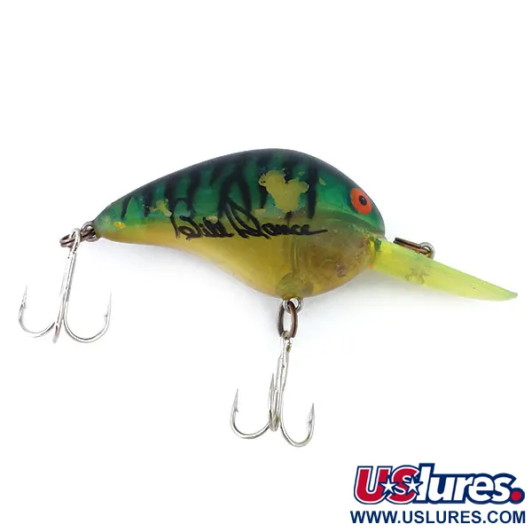 Bill Dance Signature Bomber Fat A är 6 cm (2 1/4") lång och bär den legendariska sportfiskarens namn i svart skrift mot sin grön- och gulrandiga finish. Detta rasselbete på 18 g (2/3 oz), med produktkod 10903, är konstruerat för att vara svävande (suspending), vilket gör att det stannar kvar i vattenpelaren vid invevning på djup mellan 2,9 och 3,6 m (9,5 - 11,8 ft). En stor, genomskinlig gul sked sticker ut framtill, utformad för både spinnfiske och trolling efter abborre, gös och gädda. Utvändigt har betet livfulla röda ögon och silverfärgade trekrokar. Det allmänna skicket är 4/5, med visst färgsläpp på ryggen och axelpartiet medan resten av finishen fortfarande är klar. Det tillverkades i USA som ett djupgående verktyg för en mängd olika sötvattensarter.