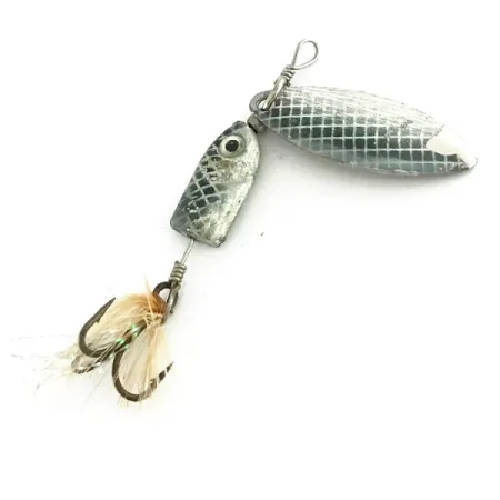 Med en vikt på 5g visar denna finsktillverkade spinnare upp det hantverk som förväntas av varumärket med rötter i Finland. Rainbow Silver-finishen på Blue Fox Flash Deep Runner har ett tydligt nätliknande fjällmönster på både den droppformade skeden och det viktade fiskhuvudet, vilket skiljer den från vanliga släta beten. Med en längd på 5,5cm bär detta exemplar produktkod 8318 och är i 4/5 skick, med en ren lyster på hårdvaran. Designen använder en fjäderbeklädd trekrok med naturfjädrar, vilket ger en mjuk profil bakom blykroppen. Samlare uppskattar inriktningen mellan skeden och den viktade kroppen, en teknisk konstruktion utformad för att nå specifika djup vid invevning. Silverpläteringen förblir blank, särskilt genom de texturerade fjälldetaljerna som definierar denna specifika färgvariation.