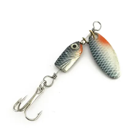 Ljusblå fjällmönster dekorerar både bladet och kroppen på denna 4 g (1/8 oz) spinnare, vilket framhäver dess klassiska finska design. Blue Fox Flash Deep Runner, med produktkod 8967, har en profil på 5 cm (2") byggd kring en tyngd kropp formad som en liten betesfisk. Kroppen har ett realistiskt målat öga och ett orangefärgat huvudparti som matchar detaljen på toppen av willow-bladet. Medan bladets framsida visar det intrikata blå och silverfärgade fjällmotivet, är baksidan utförd i polerat silver. En mässingsfärgad bygel gör att bladet kan rotera fritt kring den silverfärgade trådkonstruktionen, som är ansluten till en trekrok via en fjäderring. Skicket bedöms till 5/5, då exemplaret är exceptionellt rent med livfull färg och blanka metalldelar. Fina korsmönster på metallytorna ger ett visuellt djup till dragets utförande.