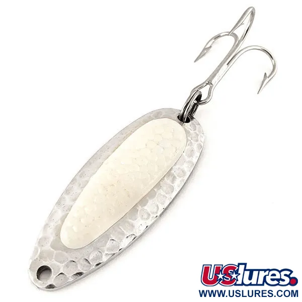 Hamrade nickeltexturer fångar ljuset över den 14 g (1/2 oz) tunga kroppen på detta klassiska skeddrag. Med det karaktäristiska vita laxrutsinsatsen är detta exemplar ett skolexempel på Blue Fox Pixee-serien, katalogiserad under produktkod 12317. Baksidan av den kraftiga mässingskroppen är tydligt stämplad med märket 'Blue Fox PIXEE PAT. PEND.', vilket speglar dess designarv från eran då National Expert Bait (Nebco) övergick till varumärket Blue Fox. Betet mäter 5,5 cm (2 1/4") i längd och uppvisar rena ytor och skarpa stämplingar, vilket ger det ett skick 5/5. Den viktade formen är specifikt konstruerad för långdistanskast i sjöar eller för att hålla sig nere i de tunga strömmarna i steelhead-älvar. En säker fjäderring ansluter den ursprungliga trekroken till stjärten, vilket gör att betet tumlar och rullar vid fiske i havsbränningar eller djupa flodhålor.