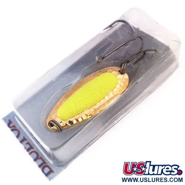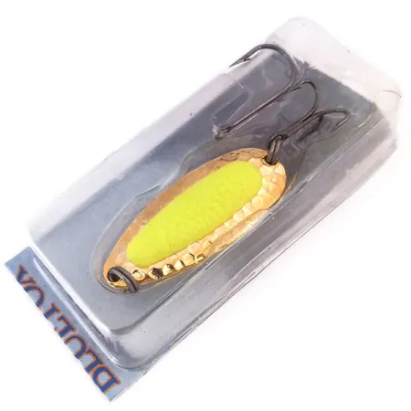 Med en vikt på 1/2oz (14g) har detta exemplar en tung mässingskropp pläterad med äkta 24 karats guld. Draget är 5,5cm långt och designen inkluderar en klargul insats som liknar ett la romkorn, vilket fungerar som en huggpunkt. Blue Fox Pixee UV med produktkod 10285 är i oanvänt skick och förvaras i sin originalförpackning. Draget är viktat för långa kast och stabilitet i strömmande vatten, där det kan tumla och rulla nära botten. Under UV-ljus eller i mörker avger insatsen ett starkt grönt sken, vilket ger hög synlighet i djupt eller grumligt vatten. Detta exemplar har skicket 5/5 och visar inga tecken på användning eller slitage på guldpläteringen.