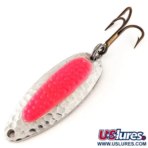 Med en vikt på 1/2 oz (14 g) är denna kraftiga mässingskropp byggd för att skära genom kustvindar och enkelt nå djupa djuphålor i älven. Längden på 2 1/4" (5,5 cm) har en klassisk finish i hamrad nickel, utformad för att sprida ljuset likt de reflekterande fjällen på en betesfisk. En karaktäristisk egenskap för produktkod 12363 är den unika laxäggsimitationen; på denna specifika Blue Fox Pixee UV-modell ger det röda inlägget en tydlig målpunkt som lyser intensivt i mörkt vatten eller vid dåliga ljusförhållanden. Den är utrustad med en trekrok i bronsfinish och en robust fjäderring, redo för pressen vid landning av lax, steelhead eller gädda. Detta drag härstammar från de ursprungliga National Expert Bait-designerna, perfektionerade för en naturlig rullande gång i strömmar eller en stabil gång vid trolling. Exemplaret är i utmärkt skick, visar tydliga tecken på noggrann förvaring och får ett skickbetyg på 5/5.