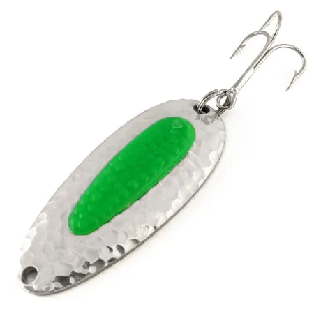 Hamrade nickelstrukturer täcker den 6,5 cm långa ytan på detta kraftiga mässingsskeddrag, vilket reflekterar ljus på ett sätt som efterliknar en panikslagen betesfisk. Denna Blue Fox Pixee UV, som identifieras med produktkod 12445, har ett distinkt grönt laxroms-imitat som är högaktivt under UV-ljus, vilket gör det till ett synligt mål under svaga ljusförhållanden. Med en vikt på 24 g är draget byggt för distans och skär enkelt genom vinden för att nå avlägsna bakvatten eller djupa flodhålor. Ursprunget kan spåras till National Expert Bait Company innan det integrerades i Blue Fox-sortimentet på 1980-talet, och det bibehåller samma höga kvalitet som står emot korrosion i saltvatten. Detta exemplar är i skick 5/5, med en ren finish och vassa originalkrokar. I snabbare flodströmmar gör mässingens densitet att den tumlar och rullar naturligt längs botten. För sjöfiske underlättar vikten djupt fiske eller stabil trolling i olika hastigheter. Den hamrade ytan ger en profil med hög kontrast som förblir effektiv i olika vattenförhållanden.