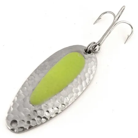 Detta skeddrag mäter 6,5 cm (2 1/2 tum) och har en kraftig mässingskropp byggd för att skära genom kustvindar och nå de djupa hålor där lax och steelhead ofta står. Den hamrade nickelfinishen ger en texturerad yta som fångar och sprider ljuset, medan den klargula laxäggsinsatsen i mitten har ett UV-sken för att förbli synlig i grumligt vatten eller vid svagt ljus. Med produktkod 12701 väger detta drag 24 g (3/4 oz) och uppvisar inga tecken på slitage med ett skickbetyg på 5/5. Modellen ingick ursprungligen i National Expert Bait (NEBCO) sortiment innan märket övergick till Blue Fox, och har en trekrok av hög kvalitet monterad med en robust fjäderring. Draget är effektivt för både spinnfiske i starka strömmar och trolling i öppet vatten, där dess densitet medger en djup presentation. Den främre kanten har en ren fästpunkt avsedd för användning med ett beteslås för att främja en naturligt rullande gång under invevning.