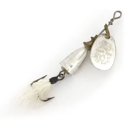 Försilvringen på skeden och klockkroppen ger detta exemplar en klassisk, ljusreflekterande profil som fångar ögat hos alla vintageentusiaster. Med en längd på 5 cm och en vikt på 3,54 g har denna Blue Fox Super Vibrax 0 Foxtail (Produktkod 9146) den karaktäristiska tvådelade klockdesignen. Skeden bär stämpeln "MADE IN FRANCE", en detalj samlare letar efter då den indikerar den tidigare produktionseran av Vibrax-serien innan tillverkningen flyttades. En handbunden vit fjäderdräkt täcker trekroken, vilket ger en distinkt visuell profil och en mjukare textur till stjärtpartiet. Silverfinishen är fortfarande blank och de mässingstonade interna komponenterna är välbevarade, vilket ger denna spinnare ett skickbetyg på 5/5. Den klockformade kroppen är konstruerad för att avge ett lågfrekvent surrande ljud när den inre komponenten roterar mot det yttre höljet under en jämn invevning. En robust ståltrådskonstruktion förbinder den bygelmonterade skeden med den fjäderförsedda kroken, vilket bibehåller stabiliteten vid fiske efter öring eller abborre med lätt utrustning.