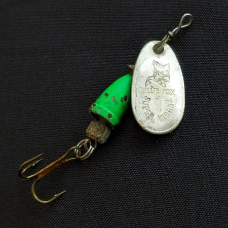 Den silverfärgade skeden på denna spinnare i storlek 1 är tydligt stämplad med den ikoniska rävlogotypen, och texten ”Made in Finland” på baksidan vittnar om dess ursprung. Blue Fox Super Vibrax 1 väger 4 g (1/8 oz) och är uppbyggd med den klassiska tvådelade klockformade kroppen. Den grönmålade ytan på den inre komponenten uppvisar visst naturligt slitage, vilket ger den ett skickbetyg på 4/5 samtidigt som den behåller sin vintagecharm. Betet har produktkod 18815 och är utrustat med en robust trekrok samt mässingsfärgade distanser längs genomlöparen. Stämplingen på skedens framsida är distinkt och visar tydligt både varumärke och storleksangivelse. Små fläckar på den gröna klockan visar var färgen har nötts ner genom åren och blottar metallbasen.