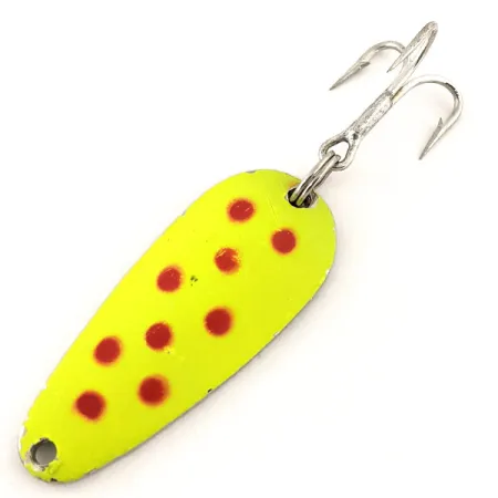 Detta amerikansktillverkade skeddrag, lackat i en livlig chartreuse-färg med tydliga röda prickar, är byggt för hög synlighet i varierande vattenförhållanden. I oanvänt skick (betyg 6) förblir finishen skarp och reflekterande över hela profilen på 5 cm (2"). Medan den fluorescerande chartreuse-färgen sticker ut i dagsljus, kommer den specifika nyttan med Blue Fox Tor-P-Do UV från dess reaktiva beläggning som lyser intensivt under UV-ljus, vilket gör att de röda prickarna framstår som mörka huggpunkter med hög kontrast. En kraftig trekrok är säkrad med en robust fjäderring vid den polerade nickelpläterade undersidan, vilket bidrar till en totalvikt på 14 g (1/2 oz) för effektivt kastfiske eller vertikalt jiggfiske. Med produktkod 12796 använder detta bete sin droppform och tyngda kropp för att bibehålla stabilitet vid trolling på djupet.