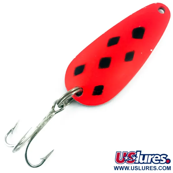Stämplat direkt i den förnicklade baksidan identifierar varumärket "BLUE FOX TACKLE TOR-P-DO" detta skeddrag på 14 g (1/2 oz) som en klassisk del av amerikansk sportfiskehistoria. Draget mäter 5 cm (2") och har en iögonfallande Fluorescent Pink framsida med fem skarpa svarta diamantmarkeringar. Dessa specifika färger är designade med UV-reaktiva egenskaper för att förbli synliga för fisk under dåliga ljusförhållanden eller i djupare vatten. Detta exemplar, med produktkod 4687, har en felfri finish på både den målade sidan och den polerade metallbaksidan. Det är utrustat med en robust fjäderring och en silverfärgad trekrok. Skicket är klassat som 5/5, då draget är anmärkningsvärt rent utan tecken på slitage på den reflekterande förnicklingen eller den fluorescerande beläggningen.