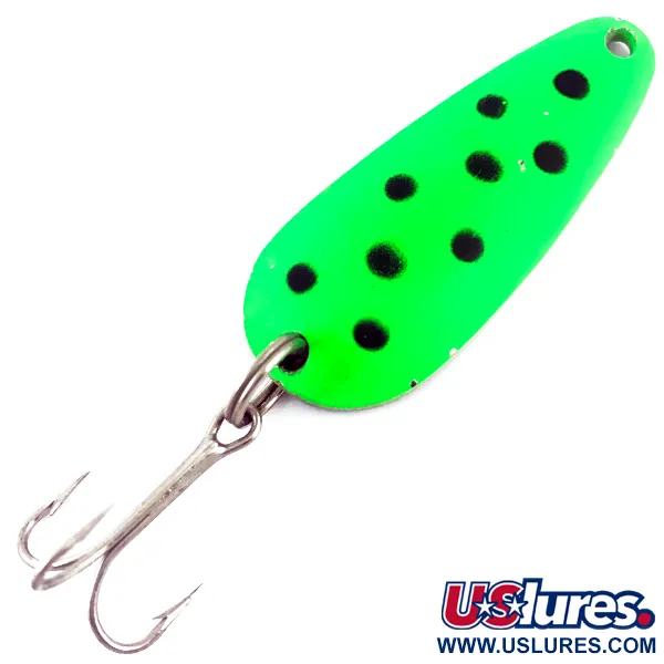 Klart fluorescerande grönt med tydliga svarta prickar definierar framsidan på detta skeddrag, som konstruerats för att förbli synligt i djupare eller grumliga vatten. Denna Blue Fox Tor-P-Do UV, med produktkod 4689, använder en specialiserad UV-reaktiv finish på sin 5 cm (2") långa kropp för att fånga ljus som är osynligt för det mänskliga ögat. Draget väger 14g (1/2oz) och är byggt på en solid förnicklad bas, med märkes- och modelldetaljer tydligt stämplade i metallen på baksidan. Monteringen består av en robust fjäderring kopplad till en vass trekrok, vilka alla är i toppskick. Tillverkat i USA, har detta exemplar betyget 5/5 och visar inga tecken på användning, samtidigt som den neongröna färgen och de svarta detaljerna har behållit sin fulla intensitet. Kontrasten mellan den livfulla ovansidan och den polerade baksidan i nickel gör det till ett utmärkt val för sportfiskare som jagar arter som reagerar på fluorescerande beten med hög synlighet. Varje stämpel på baksidan av metallen är djup och läsbar, vilket speglar den tillverkningskvalitet som Blue Fox är känd för i sin vintage-metallserie.