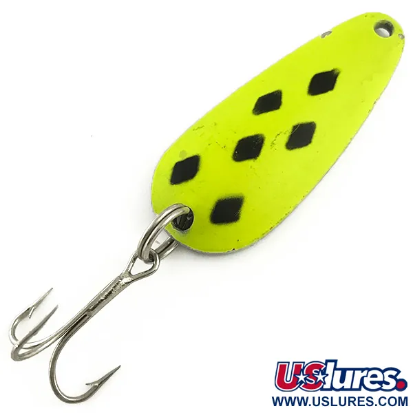 Klassisk "Five of Diamonds"-estetik definierar denna Blue Fox Tor-P-Do UV, med fem svarta diamanter precisionsmålade på en högvisst gul bas. Detta skeddrag på 1/2 oz (14 g) mäter 2" (5 cm) och har produktkod 5786. På baksidan är förnicklingen tydligt stämplad med Blue Fox-logotypen och ursprunget "USA", vilket markerar kvaliteten på den inhemska tillverkningen. Den gula finishen är specialbehandlad för att vara UV-reaktiv, vilket underlättar synligheten i djupare eller grumligt vatten. En robust fjäderring förbinder det bakre hålet med en vass trekrok. Med betyget 5/5 visar detta exemplar inga tecken på användning, och färg samt stämpling är i nyskick. Detta skeddrag för kast- och trollingfiske förblir en klassiker för sportfiskare som jagar rovfisk i olika vattenförhållanden.