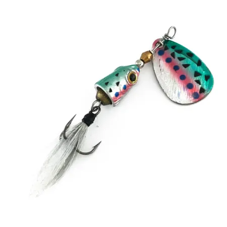 Regnbågsmönster pryder det droppformade skeden och det gjutna huvudet på denna 3/16oz (6g) spinnare. Med produktkod 7981 mäter Blue Fox Vibrax Shallow Foxtail 2 1/4" (5,5 cm) och har en silverfärgad sked i storlek 2. Skedens framsida visar en livfull gradient i kricka och rosa, markerad med svarta trianglar och blå prickar för att efterlikna en örings sidor. En viktad klockkropp, formad som ett fiskhuvud med ett klart öga, samverkar med en mässingsfärgad distanspärla för att bibehålla stabiliteten. Skedens baksida är stämplad med tillverkarens namn och storlek, vilket bekräftar dess ursprung från USA. För en naturlig profil är trekroken klädd med en tjock tofs av gråvitt hår, vilket skapar det signifikanta foxtail-utseendet. Detta exemplar är i utmärkt 5/5-skick, med originalfinish och rena komponenter genomgående.
