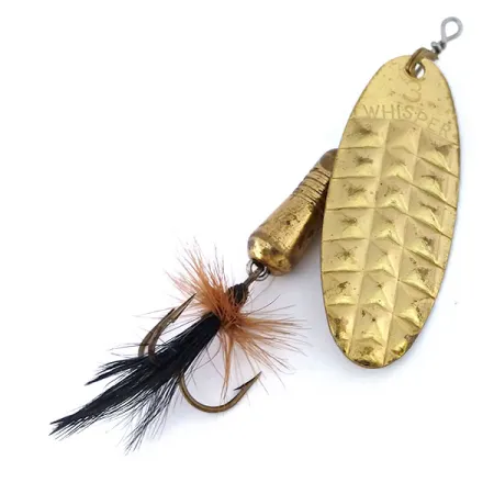 I den guldpläterade skeden finns den tydliga 'WHISPER'-märkningen stansad tillsammans med storleksbeteckningen 3. Denna Blue Fox Whisper 3, med produktkod 10404, har en hamrad diamantstruktur på den ovala skeden designad för att reflektera ljus från olika vinklar. Med en total längd på 7 cm (2 3/4") väger betet 11,5 g (2/5 oz), vilket ger tillräcklig tyngd för precisa kast i varierande miljöer. Den solida mässingskroppen följs av en trekrok klädd med en kombination av ljust brunt hackel och svarta fjädrar. Synliga lätta ytmärken och mindre oxidering på metalldelarna ger ett skickbetyg på 4/5. Blue Fox konstruerade denna USA-tillverkade spinnare med en balanserad viktfördelning avsedd för stabilitet oavsett om den fiskas hem i stilla sjöar eller i måttliga strömmar.