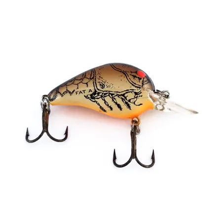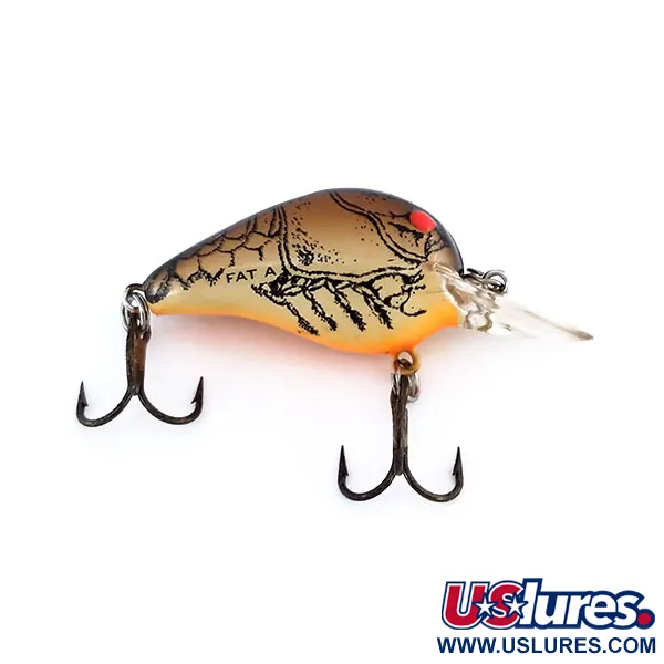 Iklädd CBB-färgmönstret har denna kompakta ultralätta wobbler en beige kropp med mörk kräftskalsgrafik och en lysande orange buk. Med en längd på 3 cm (1 1/4") och en vikt på 2 g (1/16 oz) fungerar den som ett specialiserat verktyg för abborre och färna. Den genomskinliga skoveln är utformad för att nå djup mellan 1,2 m (3,9 ft) och 1,8 m (5,9 ft) vid normal hemvevning. Detta USA-tillverkade exemplar, katalogiserat under produktkod 9961, har modellnamnet "FAT A" tydligt stämplat på sidan. Två mörka trekrokar är fästa med robusta fjäderringar, vilket matchar wobblerns toppskick. Tydliga röda ögon är placerade precis ovanför skoveln och ger en skarp fokuspunkt mot den mörkbruna toningen på huvudet och ryggen.