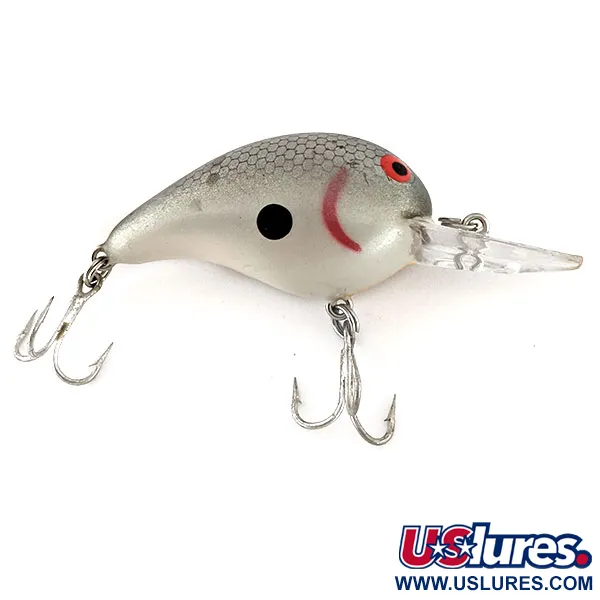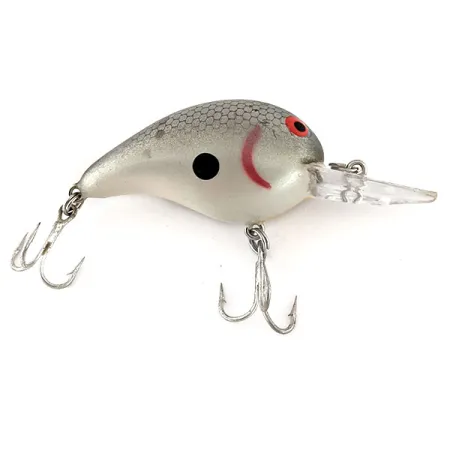 Ett tydligt silverfärgat hexagonalt fjällmönster täcker den övre ryggen på denna 1/3oz (10g) crankbait, vilket ger ett texturerat utseende mot de släta sidorna med grå-vit gradient. Denna USA-tillverkade Bomber Fat A B05F, med produktkod 12427, har en framträdande svart prick på sidan och ett svängt rött gälstreck bakom stora röda ögon med svarta pupiller. Den flytande kroppen är 2" (5 cm) lång och utrustad med en klar, rundad haksked optimerad för ett fiskedjup på 1,8-2,4 m (6-8 ft). Komponenterna består av två originaltrekrokar i silverfinish, vilket gör den till ett klassiskt val för fiske efter abborre eller färna. I 5/5-skick visar betet inga tecken på användning och bibehåller sin högblanka finish över hela profilen.